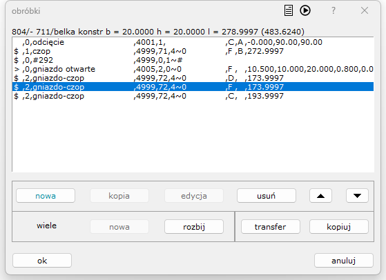 - kopia – pozwala powielić wybraną (podświetlaną) obróbkę z listy. Utworzoną kopię można poddać modyfikacjom