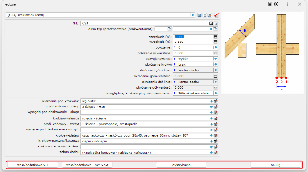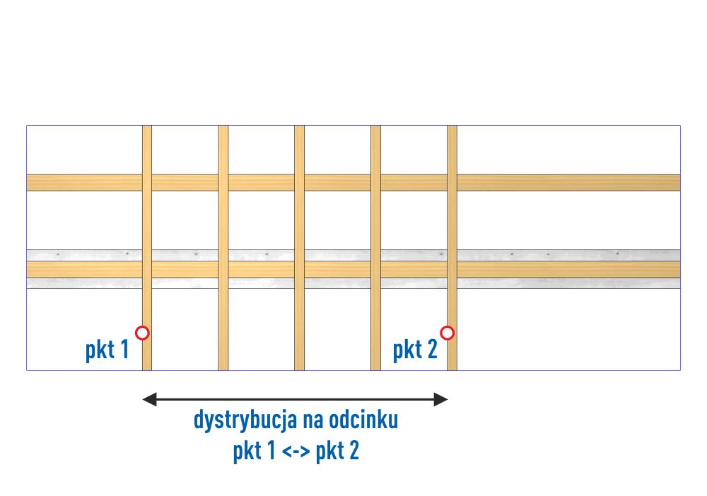 - stała/dodatkowa – pkt->pkt – dystrybucja krokwi na odcinku zdefiniowanym dwoma punktami (przez użytkownika). Krokwie mogą mieć atrybut stała lub dodatkowa