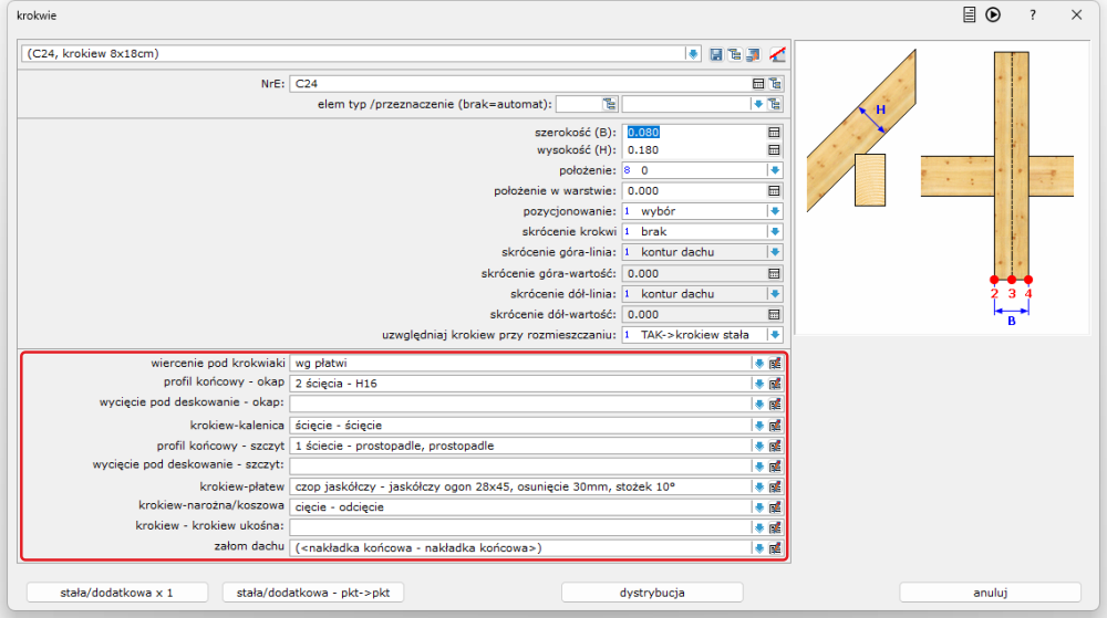 - dystrybucja – dynamiczna dystrybucja krokwi według granic na połaci – krawędzi połaci lub innych krokwi. Krokiew automatycznie otrzymuje atrybut: „dystrybucyjna“: